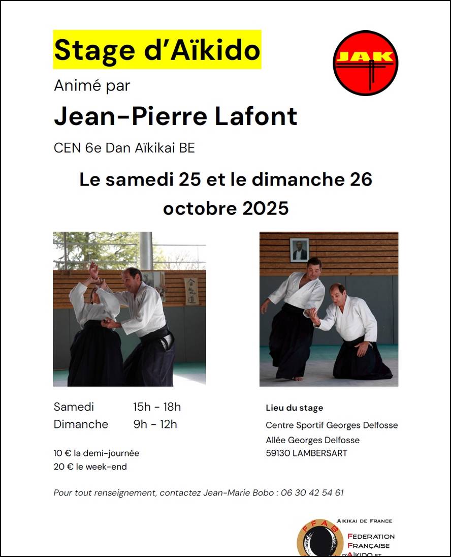 Le club de Lambersart organise un stage privé animé par Jean-Pierre Lafont (6° dan, Chargé d’Enseignement National). Le stage se tiendra samedi 25 et dimanche 26 octobre 2025.